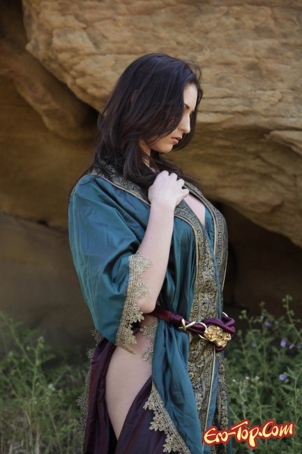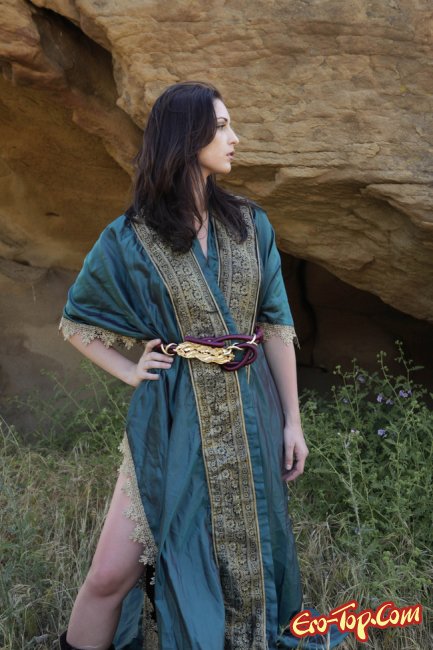 Дамочка с широким тазом и привлекательным бюстом красивой формы выбралась на природу в необычном наряде. Судя по всему, она в образе сексуальной принцессы с каким-то артефактом в руках. В процессе фотосессии наша героиня полностью обнажилась и предстала перед нами в разнообразных позах. Следует отметить, что у девушки небритая киска и шикарные бедра, по которым так и хочется шлепнуть.