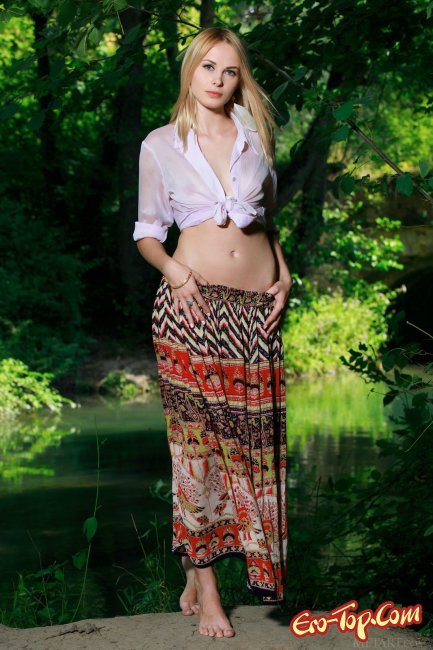 Девушка появляется перед нами в белой блузке и длинной юбке, но сразу же начинает раздеваться и скоро оказывается совершенно голая. Блондинка со стройной фигуркой демонстрирует нам своё тело, маленькую подтянутую грудь, бритую писю и отличную задницу! Всё это происходит в каком-то лесу, что придаёт фотографиям особую атмосферу.