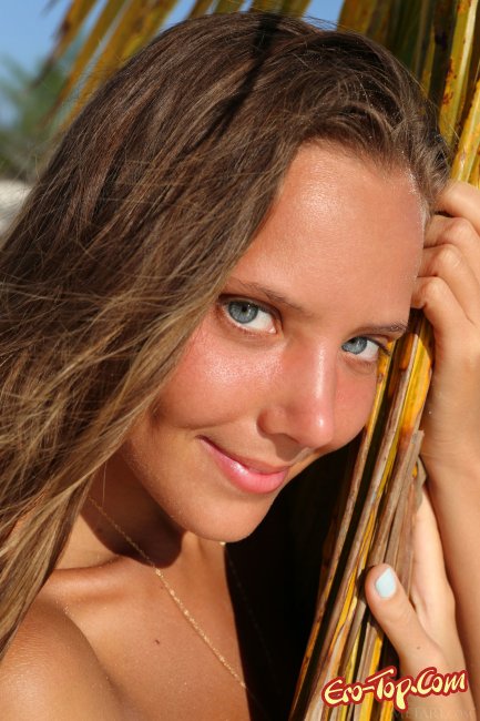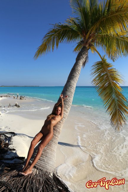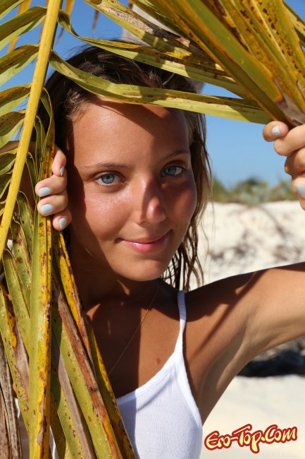 Молодая, привлекательная девушка Katya Clover позирует на песчаном пляже океана. Девушка снимает свой купальник и показывает нам свою грудь, попку и другие интимные места.