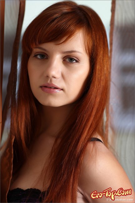 Стройная рыжая девушка в чёрных чулках и без трусиков показывает нам свою упругую голую попу с пышными ягодицами.