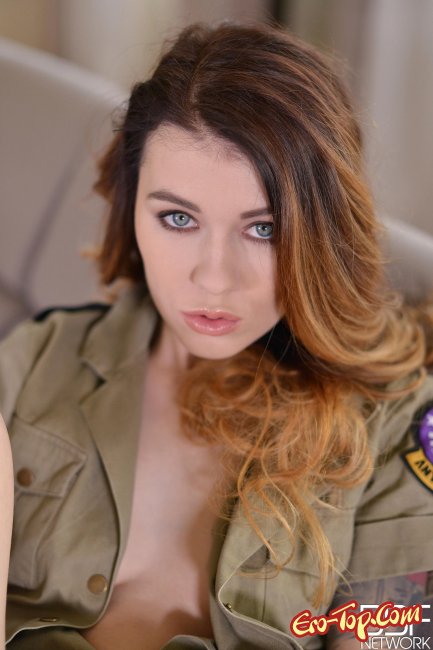 Соблазнительная девушка, эротическая модель по имени Misha Cross решила представить нам свои фото в стиле милитари. Красотка в форме похожей на военную и в маскировочных стрингах, соблазняет нас с экранов мониторов. Девушка медленно раздевается и оказавшись голой, она достаёт небольшой вибратор, который тут же засовывает в мокрую от возбуждения киску.