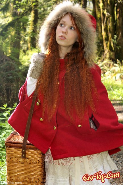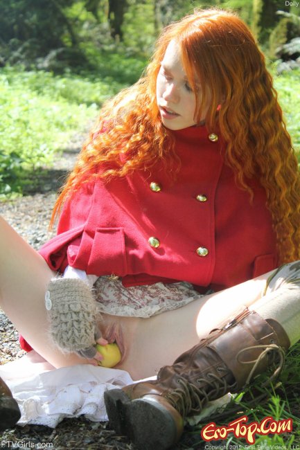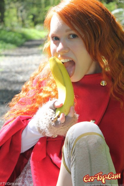 Молодая девушка с длинными и кудрявыми рыжими волосами предстаёт перед нами в образе развратной красной шапочки. Вот только шапочку девушка где-то потеряла, а в корзинке вместо пирожков у неё бананы. Девушка задирает подол платья и мы можем наблюдать что красотка не надела трусиков. Немного поигравшись с бритой писькой, рыжая бестия берёт банан и засовывает его поглубже в свою мокрую киску.