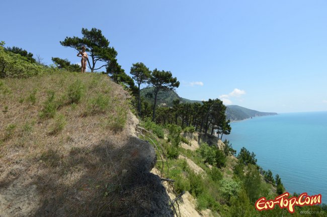 Молодая, привлекательная модель Foxy Di позирует голая на фоне очень красивого пейзажа. Девушка находится на вершине горы, а внизу, под ней мы можем наблюдать голубое море.
