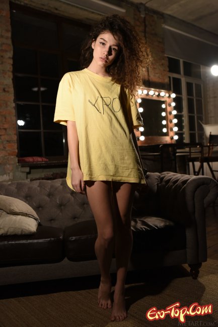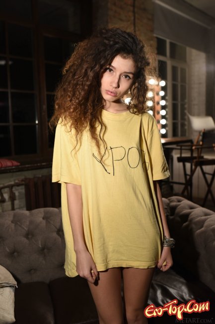Очень симпатичная девушка со стройным телом позирует голая перед фото камерой. Кудрявая милашка с пышными волосами снимает майку и открывает нам своё восхитительное, голое тело с маленькой грудью и офигенной попкой.