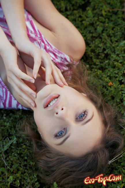 Очаровательная и очень милая девушка демонстрирует свою стройную фигурку на фоне чудесной природы. Красавица снимает платье и открывает нам свою прекрасную, красивую киску с идеально выбритыми половыми губками.
