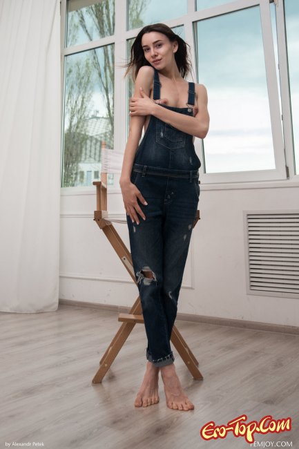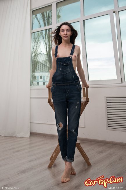 Худая девушка показывается перед нами в джинсовом комбинезоне, под которым у девушки нет ничего, кроме её очаровательного голого тела. Сбросив комбез, красотка демонстрирует нам упругую грудь небольшого размера, подтянутую попку и красивую, гладко выбритую киску.