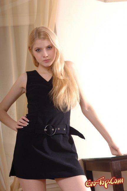 Сексуальная блондинка позирует в коротком чёрном платье, под которым у неё нет трусиков. Девушка задирает подол открывает нам свою соблазнительную писю с пушком из волос.