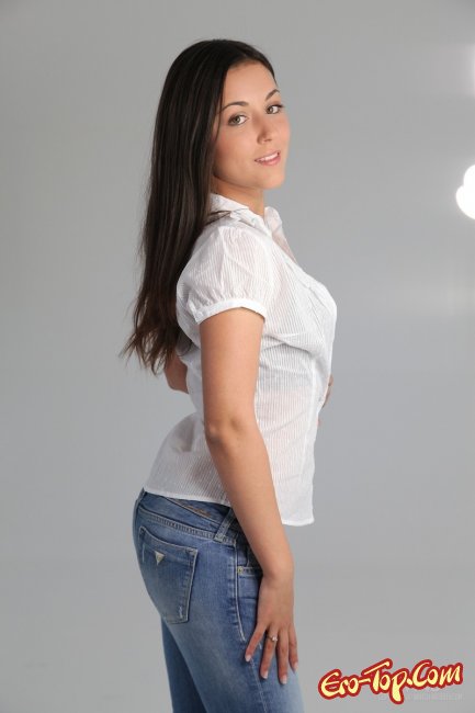 Сексуальная брюнетка сняла белую блузку, джинсы и нижнее бельё, оставшись голой в одних туфлях. Затем девушка широко раздвинула ноги, открывая чудесный вид на нежную бритую киску.