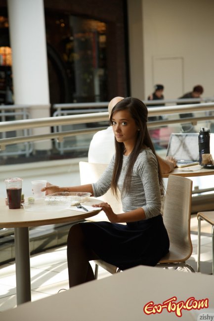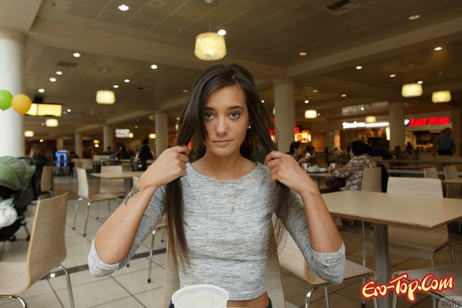 Очаровательная молодая девушка гуляет по торговому центру в колготках без трусов под ними, так же на девушке короткая юбочка и кофточка. Периодически девушка задирает кофту показывая свою маленькую упругую грудь, а где-то пытается снять колготки, открывая доступ к своей сладкой киске.
