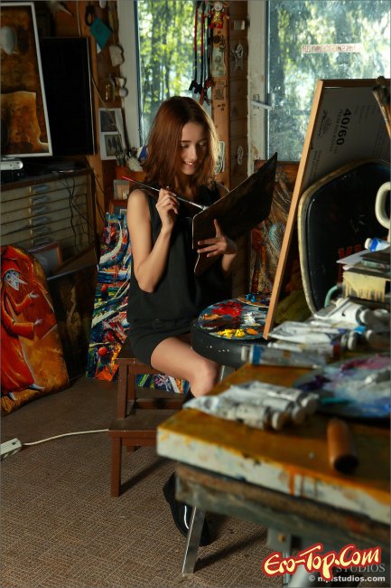 Обворожительная девушка в чарующей обстановке позирует перед фото камерой. Симпатичная рыжая милашка художница раздевается до гола и демонстрирует нам своё прекрасное, стройное тело.