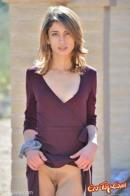 Худенькая девушка игриво позирует перед фото камерой. Она задирает подол своего платья обнажая свою голую попку без трусиков и красивую киску.