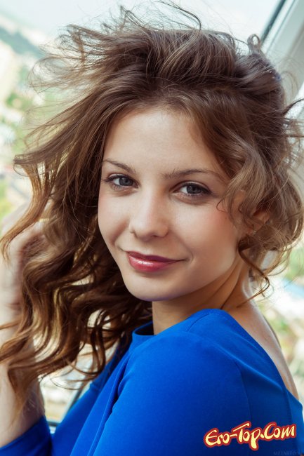 Обаятельная девушка с сексуальной фигуркой позирует в синем платье, под которым нет трусиков. Девушка всячески задирает ноги и мы можем наблюдать её голую киску.