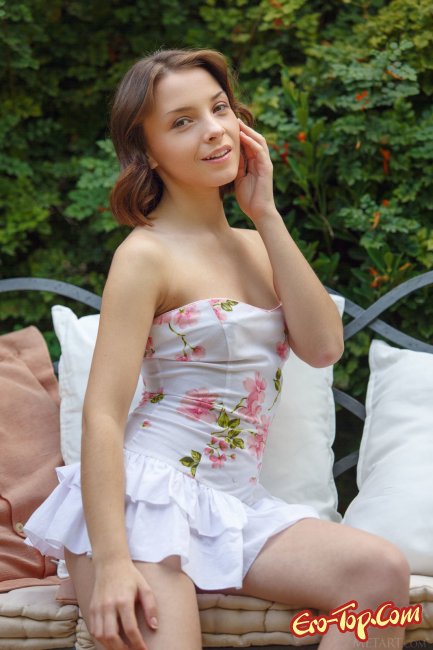 Соблазнительная девушка в красивом платье задирает подол и стягивает розовые трусики со своей упругой попки. Затем девушка поворачивается лицом к камере и демонстрирует милую, гладко выбритую киску.