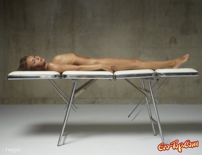 Голая девушка с худым телом позирует на массажном столе. У красотки проколоты соски в которых торчит пирсинг - сомнительное украшение...