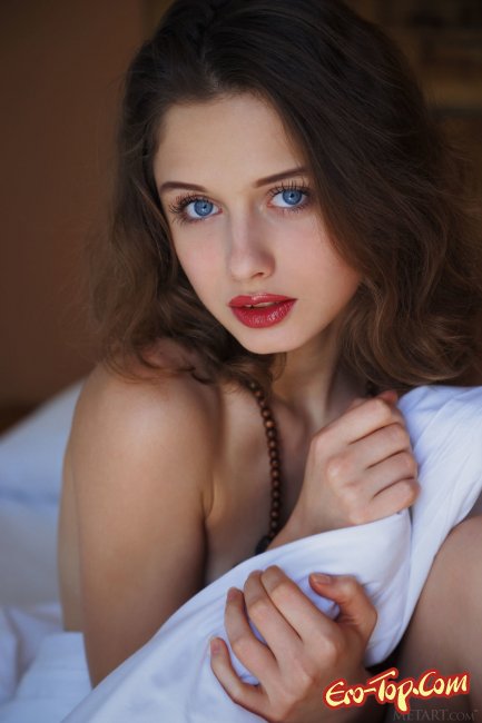 Симпатичная девушка накрасила губы ярко-красной помадой и голая позирует в постели с белыми простынями. Красавица со стройной фигуркой в откровенных и очень сексуальных позах демонстрирует свои самые интимные части тела и получает от этого массу удовольствия.