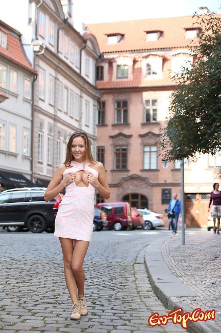 Милая блондинка с красивой фигурой разделась на европейской улице, выставив на обозрение своё голое тело.