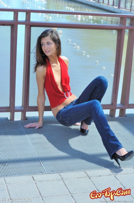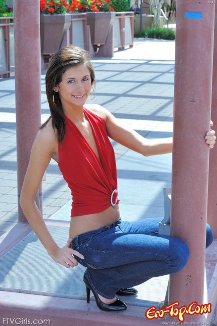 Стройная девушка в джинсах и красной кофточке прогуливаясь по городу, в какой-то момент, решила продемонстрировать свою киску и маленькую грудь. В будущем, найдя самое подходящее местечко она вначале засветила сиськи, а после показала гладко выбритую письку.
