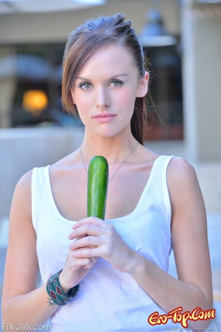 Выйдя на улицу, симпатичная девушка решила немного расслабится и принялась мастурбировать кабачком свою гладенькую киску. В дальнейшем она отправилась в бассейн, где не снимая белую майку начала купаться, показывая маленькую грудь с твердыми возбужденными сосочками.