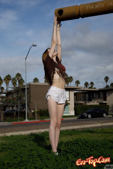 Решив прогулять по городу, худенькая девушка в коротеньких шортиках, белого цвета, и футболке старалась выбирать максимально уникальные места, в которых с довольствием позировала, показывая натуральную грудь. Таким образом молоденькая крошка смогла ощутить порцию удовольствия от всего происходящего.