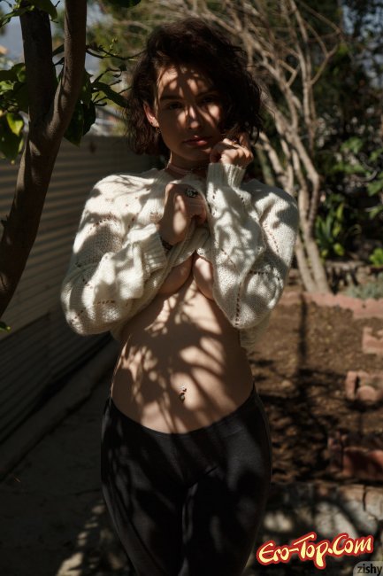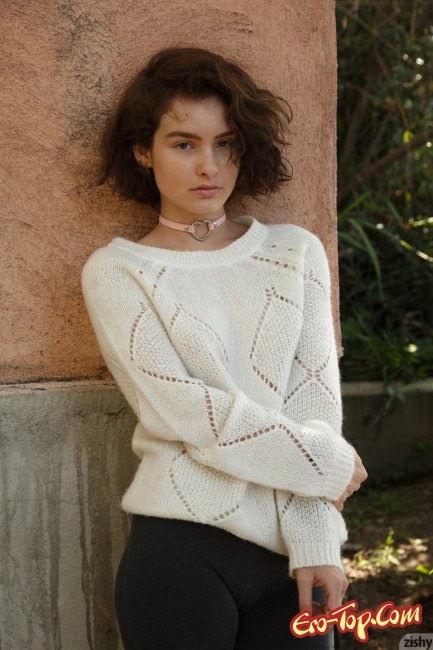 Нарядившись в черные немного просвещающиеся лосины и вязанный свитер, симпатичная молодая девушка начинает эротично позировать на улице, в процессе немного показывая разные части тела. Засвечивая плоский животик, очаровательная крошка с чокером на шее решает высунуть язык, а после и немного засветить упругие ягодицы.