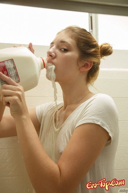 Нарядившись в полупрозрачный черный боди, невероятно сексуальная девушка с накрашенными в красный цвет губками начинает возбуждающе позировать на кровати, в процессе облизывая пальчики и тягая сосочек, а так же планируя перебраться в ванную. В будущем молодая крошка все же меняет место дислокации и обливается молоком, параллельно показывая маленькую грудь.