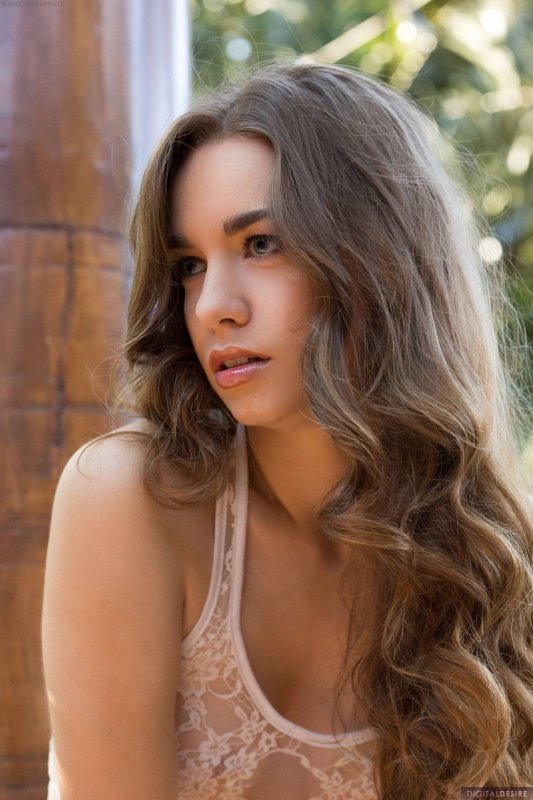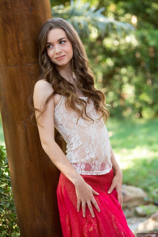 Нарядившись в прозрачную кружевную майку и длинную юбку без трусиков, симпатичная девица с вьющимися локонами начинает эротично позировать на улице, в процессе медленно снимая с себя всю одежду. Для начала высокая молодая крошка засвечивает бритую письку с волосатым лобком, а после упругие натуральные сиськи с возбужденными от происходящего сосочками.