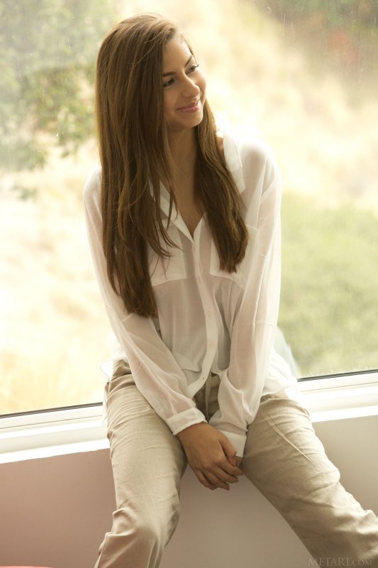 Начав медленно раздеваться рядом с окном, уже через несколько минут симпатичная шатенка осталась только в одной рубашке, в процессе лишившись штанов прикрывающих промежность, которую девушка собственно и желала показать. Чередуя разные позиции и засвечивая бритую письку и натуральные сиськи, крошка ощущала удовольствие.