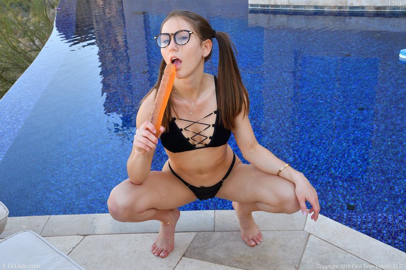 Начав позировать рядом с бассейном, игривая девка в очках и возбуждающем нижнем белье, в будущем перебралась в спальню, где принялась удовлетворяться в постели, в процессе окунаясь самотыком в разработанные гладко выбритые дырки. Предварительно молоденькая девушка с маленькой грудью все же скинула трусики и лифчик.