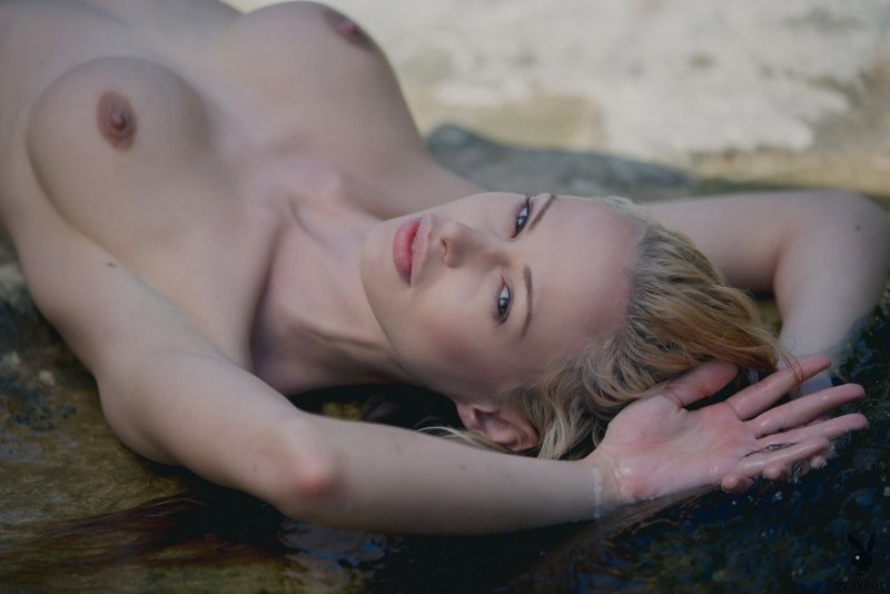 Немного намочившись в речке, высокая худенькая девка с большими и очень упругими силиконовыми сиськами позирует на берегу, в процессе медленно снимая мокрую майку и трусики. Как только стройняшка полностью оголилась, она устроилась на камнях и раздвигая промежность выставляла перед камерой гладко выбритую письку, нежно трогая себя руками при этом.