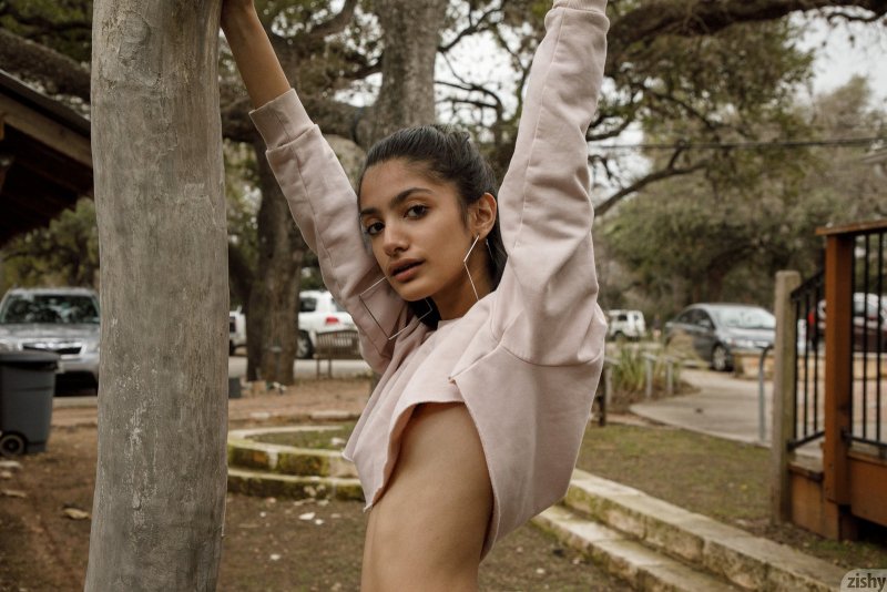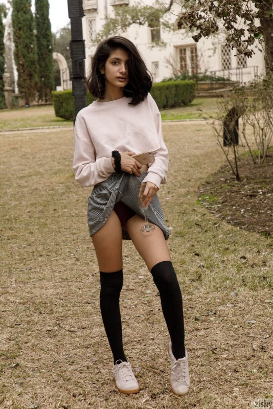 Привлекательная молодая индуска с худенькой фигурой в короткой юбке и черных гольфах соблазнительно вертится перед камерой, гуляя на улице. В процессе съёмки, стройняшка показывала плоские сиськи, а прогибаясь раком засветила трусы под юбкой, нежно поглаживая себя руками при этом.