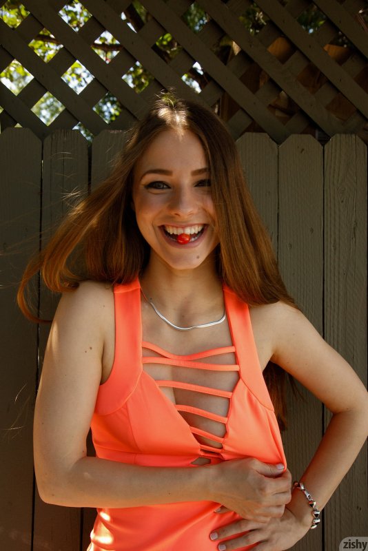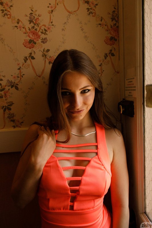 Очаровательная улыбчивая шатенка с худенькой талией в коротком платье и туфлях, прогулявшись на улице возвращается домой и засвечивает бритую письку. В процессе сексуальная молодая девушка так же демонстрирует попку и маленькие сиськи, раздеваясь для этого догола.