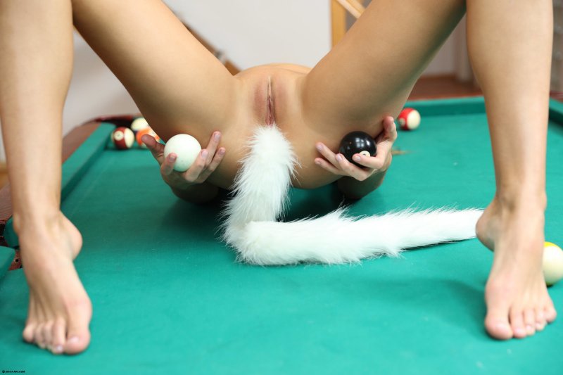 Вооружившись кием, русская и весьма красивая девица в ажурном нижнем белье, забравшись на бильярдный стол, эротично позирует и максимально возбуждающе прогибает спинку. Наслаждаясь, сексуальная стройняшка раздевается догола и продолжая начатое светит маленькие сиськи с упругой попой и бритую письку, порой так же делая акцент на торчащем и ануса хвостике.