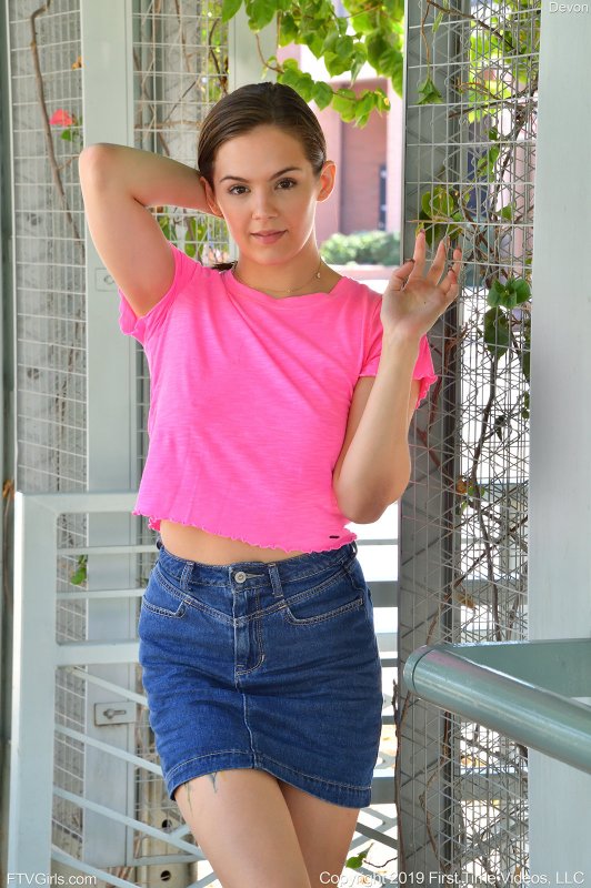 Привлекательная девица с милой улыбкой, прогуливаясь на улице в розовой футболке и короткой джинсовой юбке то и дело нагибается раком, что бы засветить перед нами розовые трусики. Шалунья ничуть не стесняется такой откровенности, а напротив, заводится всё сильнее, позволяя нам посмотреть на её аппетитную грудь.