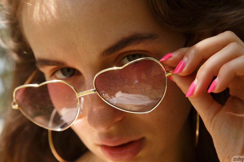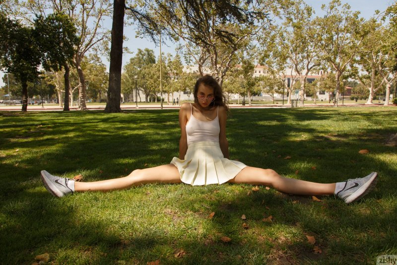 Прогуливаясь жарким днем на улице, симпатичная проказница в коротком платье и очках в каике-то моменты эротично позирует и засвечивает белые трусы и попку под юбкой. Ощутив возбуждение и расположившись на газоне, сексуальная молодая девушка так же демонстрировала упругие сиськи.
