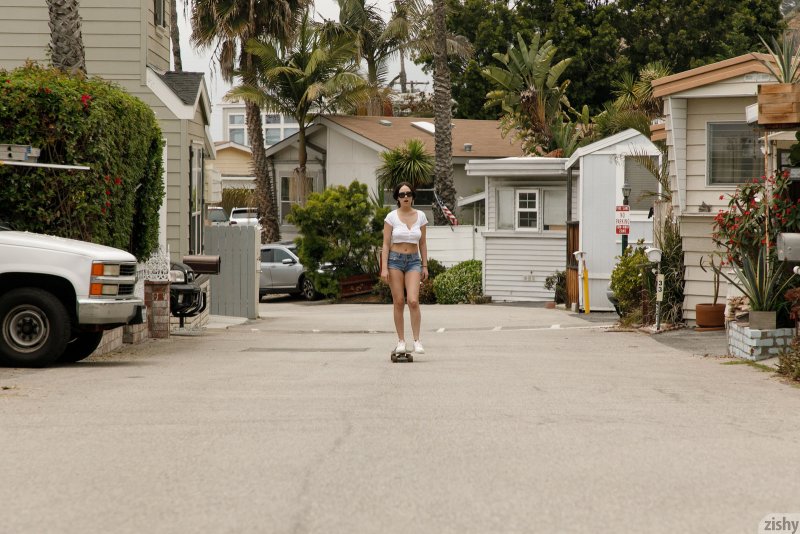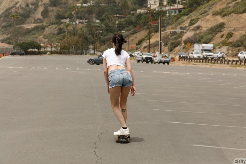 Развязная сучка в коротких джинсовых шортах и футболке гуляет на улице и катается на скейте, при этом мило улыбаясь и строя глазки на снимающую её камеру. В будущем сексуальная милашка немного засвечивает натуральные сиськи и переодевшись в купальник продолжает показывать себя на пляже.