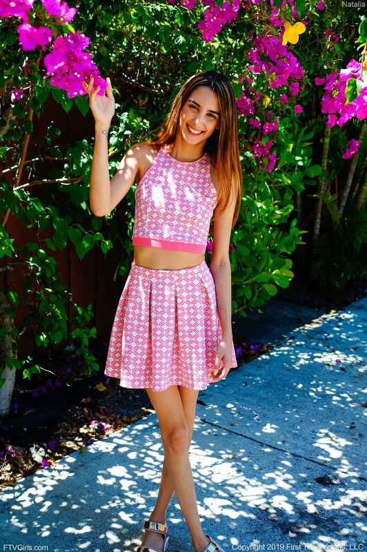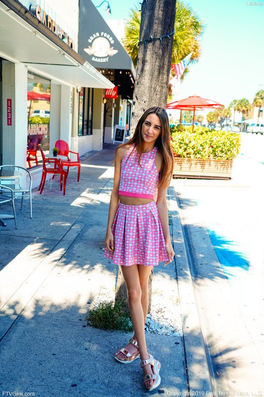 Худенькая красавица в короткой юбке и майке без трусиков, прогуливаясь на улице, решает немного попозировать и засветить бритую письку. Игриво улыбаясь и меняя разные ракурсы, сексуальная девушка так же немного демонстрировала маленькие сиськи с аккуратной торчащими сосочками.