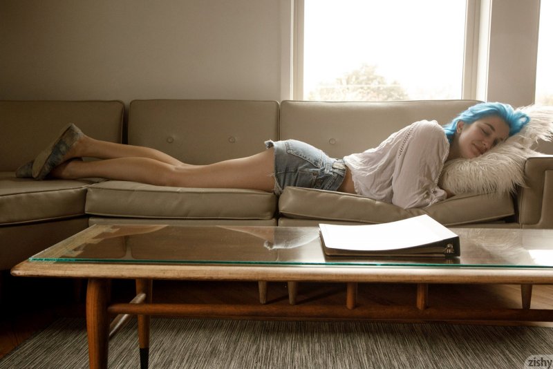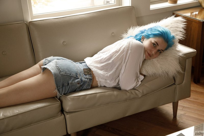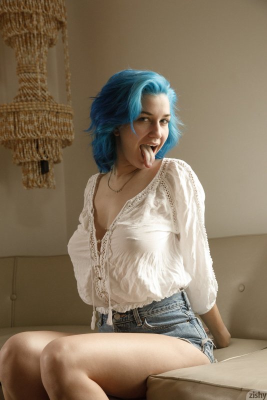 Не обременённая излишней скромностью неформалка с голубыми волосами в коротких шортах и блузке берется эротично позировать дома, с радостью демонстрируя перед нами голые большие натуральные титьки с пирсингом в сосках. Ощущая растекающееся по её телу возбуждение, распутная девушка порой поджимала ноги и засвечивала промежность с ляжками.