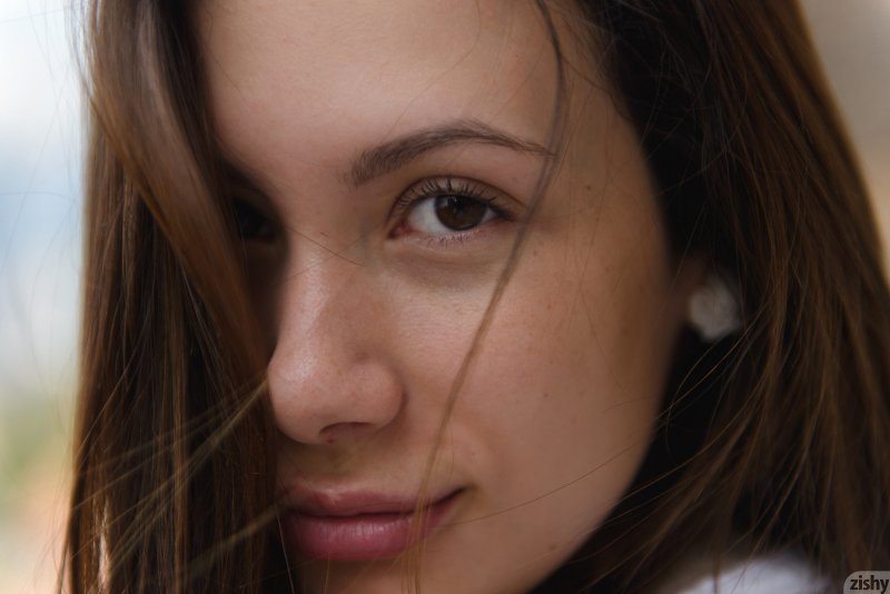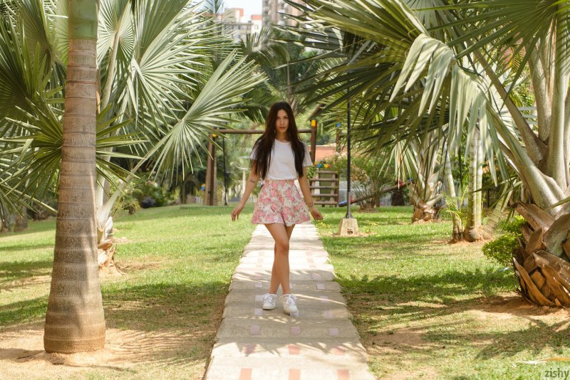 Обворожительная молодая девушка со стройной фигуркой и пухлыми губками гуляет на улице в короткой юбке и футболке, кокетливо позируя при этом перед фотографом с камерой. Страстно желая понравится нам с вами, сексуальная красавица позволяла взглянуть на её белые кружевные трусики под юбкой, для этого присаживаясь и раздвигая промежность.