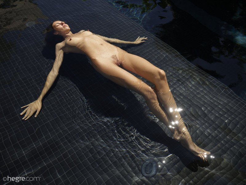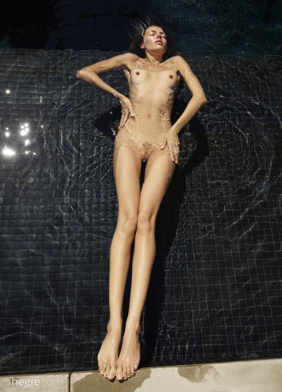 Готовая на многое ради своей популярности длинноногая девка с худым телом плавает голая в бассейне, надеясь, что это подарит ей массу новых поклонников и почитателей её прелестей. Во время купания сексуальная дамочка с маленькой грудью и торчащими сосочками продемонстрировала животик и бритую письку, а так же тощую попку.