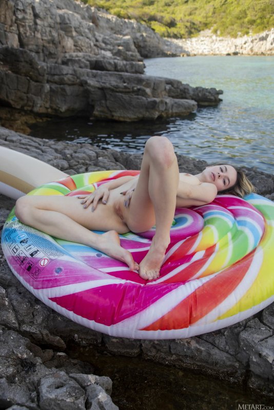 Совершенно не стесняясь фотографирующей ее камеры и постепенно сняв с себя всю одежду, развратная голая девица с миниатюрными натуральными сиськами возбуждающе раскрыла свою бритую промежность на общественном пляже и, чувственно извиваясь всем телом на надувной игрушке, открыто предлагает поглазеть на ее самые интимные места.