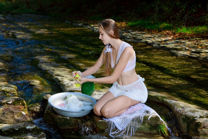 Вспотев от усердной работы и с удовольствием стянув с себя всю одежду, миниатюрная обнаженная девица стирает грязное белье в речке. Энергично извиваясь всем телом на неудобном камне, молодая красавица умудрилась во всей красе засветить перед нами свою бритую промежность с аккуратной розовой писечкой.