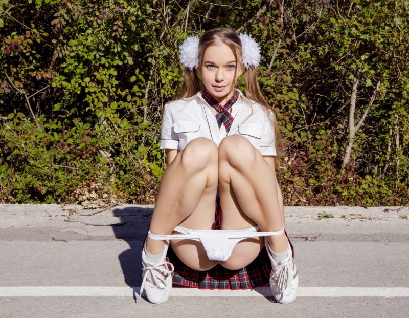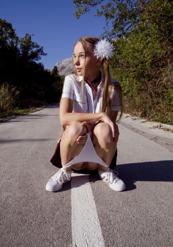 Эротика » Эротические модели » Молодая шлюшка дрочит бритую пизду на дороге