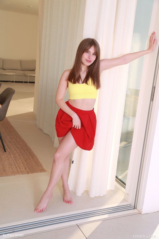 Возбуждающе медленно стянув с себя майку с юбочкой и оголив свои маленькие сиськи, русая шалунья не стала останавливаться на этом и с удовольствием сняла трусы перед камерой. Затем голая дамочка с раскрытой на показ рогаткой похотливо тычется вперед своей писькой и раскрывает пальчиками сочные половые губы.