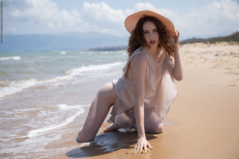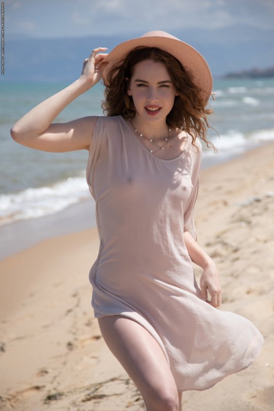 Эротично позируя перед камерой в просвечивающей одежде и кокетливой шляпке, сексуальная красотка игриво намочила свое легкое платье в море и безумно возбуждает всех отдыхающих на пляже изгибами своего тела. Постепенно раздевшись до гола, горячая штучка с натуральной упругой грудью опускается на мокрый песок и мельком засвечивает между ног свою бритую письку.