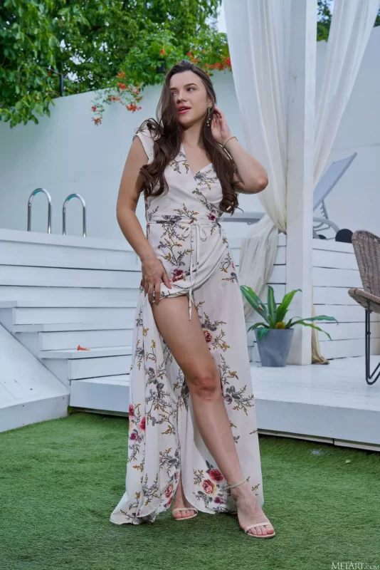 Страстно распахнув на себе платье и легко скинув его на землю, горячая дерзкая штучка с натуральными сиськами развратно извивается на газоне всем телом в самых откровенных позах и во всех подробностях хвастается перед камерой голой бритой киской у себя на даче.