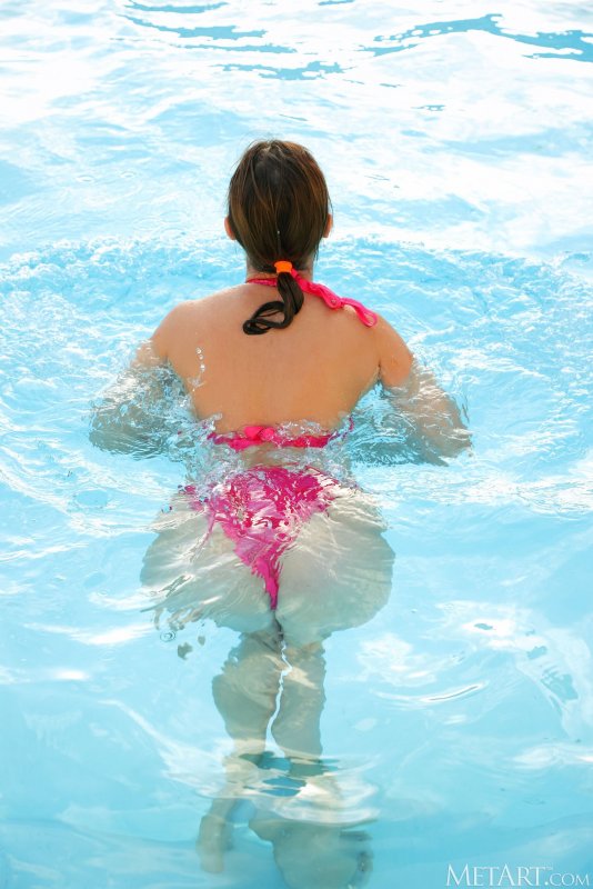 Немного поплавав в прохладном бассейне, а затем начав медленно снимать с себя перед камерой открытый купальник, горячая эротическая модель с нежными упругими сиськами оголила свою бритую киску на шезлонге и в самых неприличных позах принялась хвастаться ею между широко раздвинутых ног.