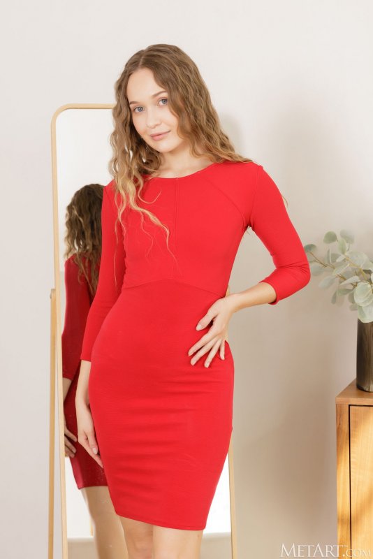 Соблазнительно медленно сняв перед нами красное платье с трусиками, голая девушка с пухлыми нежными сосочками на плоских титьках эротично извивается в разных позах на диване и, замирая перед камерой с широко раздвинутыми ногами, выставляет на показ свою бритую розовую пизду.