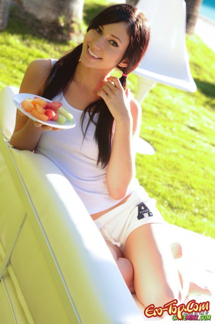 Красивенькая молодуха сидит в кресле на свежем воздухе и поедает нарезанные в тарелочке фрукты. Потом куколка с косичкам начинает медленно снимать с себя белую маячку оголяя маленькие титьки, которые как раз помещаются в ладошку. После этого девочка становится на четвереньки и снимает с себя красивые шортики, под которыми нету трусиков. Улыбаясь детка показывает сочную попочку и розовенькую киску, которую она нежно гладит кусочком фрукта.