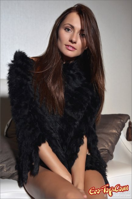 Сексапильная девушка с красивым телом снимает черную шубку и показывает маленькие упругие груди. Потом молоденькая куколка стягивает с себя трусики сидя в белом кресле и демонстрирует обнаженную попку. Красотка слегка расставляет ножки и крупным планом демонстрирует гладко побритую щелку.
