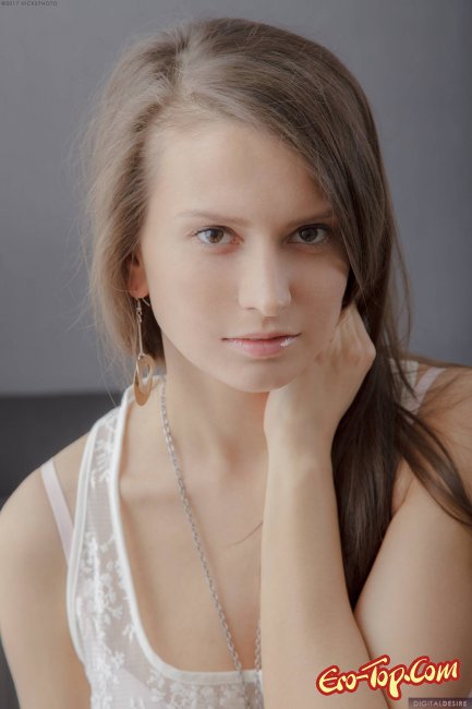 Симпатичная худенькая девушка в белом платье усевшись на краюшек дивана принялась медленно раздеваться, снимая с себя, в том числе и нижнее белье. Полностью оголившись красотка демонстрирует натуральную грудь с розовыми сосками, а так же гладенькую письку.